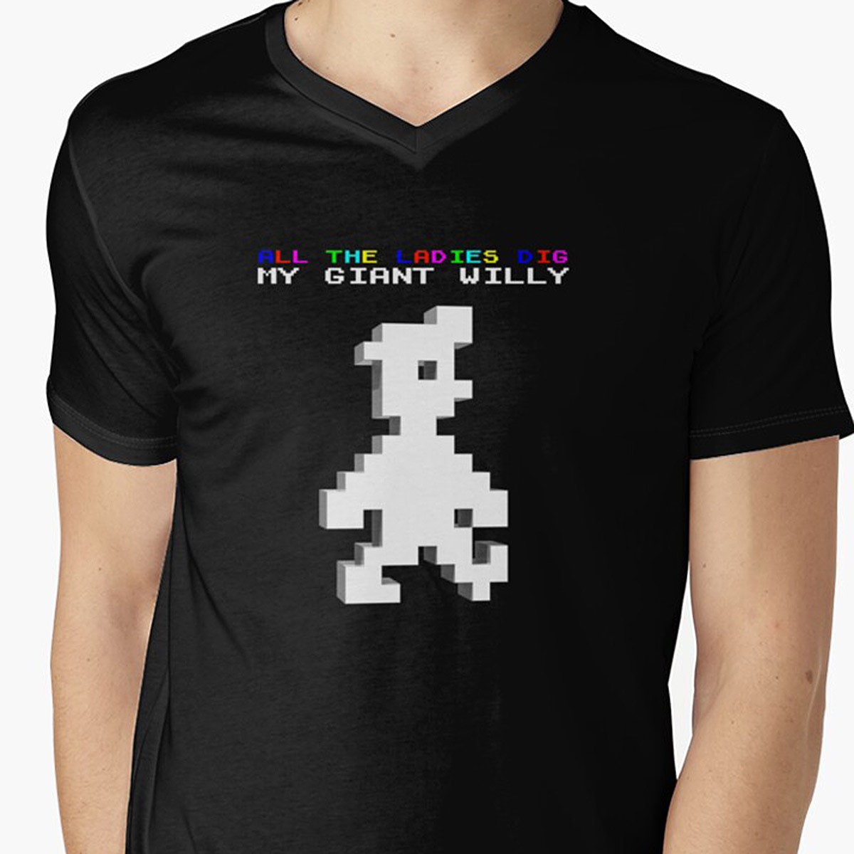 Wear your giant willy with pride! Show your love of retro gaming with a giant Miner Willy on your chest! relive the golden days of Manic Miner and Jet Set Willy, Sinclair ZX Spectrums and Commodore 64s. Hark back to a time when games were simpler and the sprites which seemed so mind blowing at the time, were just a handful of pixels.